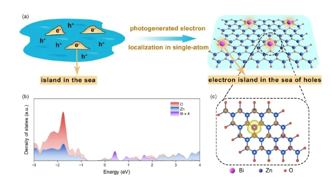對(duì)此,中國科學(xué)院高能物理研究所的鄭黎榮副研究員與中國科學(xué)技術(shù)大學(xué)謝毅教授和張曉東教授課題組提出了一種光生電子島策略來促進(jìn)光生載流子的有效分離,從而實(shí)現(xiàn)了常溫常壓下的光催化二氧化碳化學(xué)固定為環(huán)狀碳酸酯反應(yīng)。通過簡單的濕化學(xué)法,表面負(fù)載Bi單原子的ZnO納米片(Bi1/ZnO)催化劑被成功合成,同時(shí)通過HAADF-STEM和XAFS表征證實(shí)了Bi單原子的存在,基于擬合結(jié)果確定Bi原子與3個(gè)O原子進(jìn)行配位。進(jìn)一步地,分子動(dòng)力學(xué)模擬顯示Bi1/ZnO具有良好的結(jié)構(gòu)穩(wěn)定性,同時(shí)徑向分布函數(shù)分析表明Bi單原子的配位數(shù)以及配位鍵長均與XAFS的測(cè)試結(jié)果相吻合。原位XPS顯示,在光照的條件下,光生電子局域在Bi單原子附近,形成光生電子島,而光生空穴離域在ZnO基底之中,形成“空穴?!?,這與理論計(jì)算態(tài)密度中Bi單原子僅對(duì)催化劑整體的導(dǎo)帶有貢獻(xiàn)的結(jié)果相一致。PL、光電流以及電子阻抗譜等光電化學(xué)測(cè)試證明了Bi單原子介導(dǎo)的光生電子島有效促進(jìn)了光生載流子的分離。