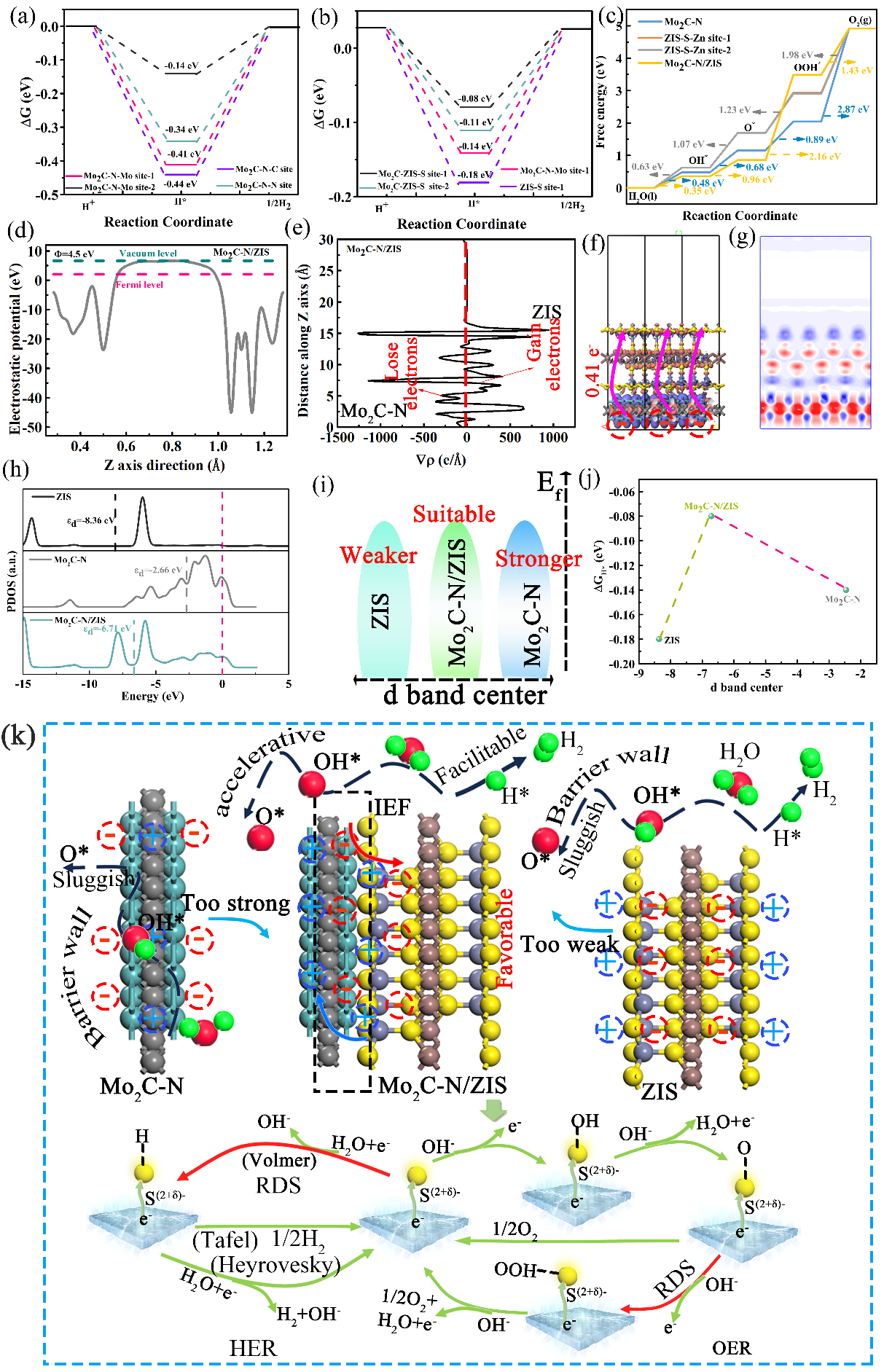 DFT計(jì)算表明,Mo2C-N/ZIS 具有合適的氫質(zhì)子和氫氧中間產(chǎn)物的吸附能,加速OER, HER反應(yīng)速率,Mo2C-N/ZIS的肖特基結(jié)具有雙重有利的轉(zhuǎn)移路線,增強(qiáng)了光生載流子遷移,減少了ZIS的本體和表面復(fù)合。此外,原子的重分布電子構(gòu)型和局部電荷分布狀態(tài)不僅可以提高本征活性,還可以調(diào)節(jié)氫和氧中間體的吸附和解吸行為。因此,Mo2C-N/ZIS催化劑具有良好的PHE/HER/OER性能,是光/電化學(xué)應(yīng)用的理想催化劑。