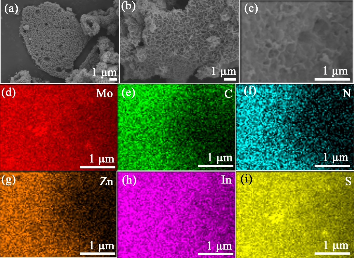 圖4 10-a-MoO3@Mo9O26/ZIS, (b) 10-MoO2@C/ZIS, (c) 20-Mo2C-N/ZIS的SEM和元素組成分析