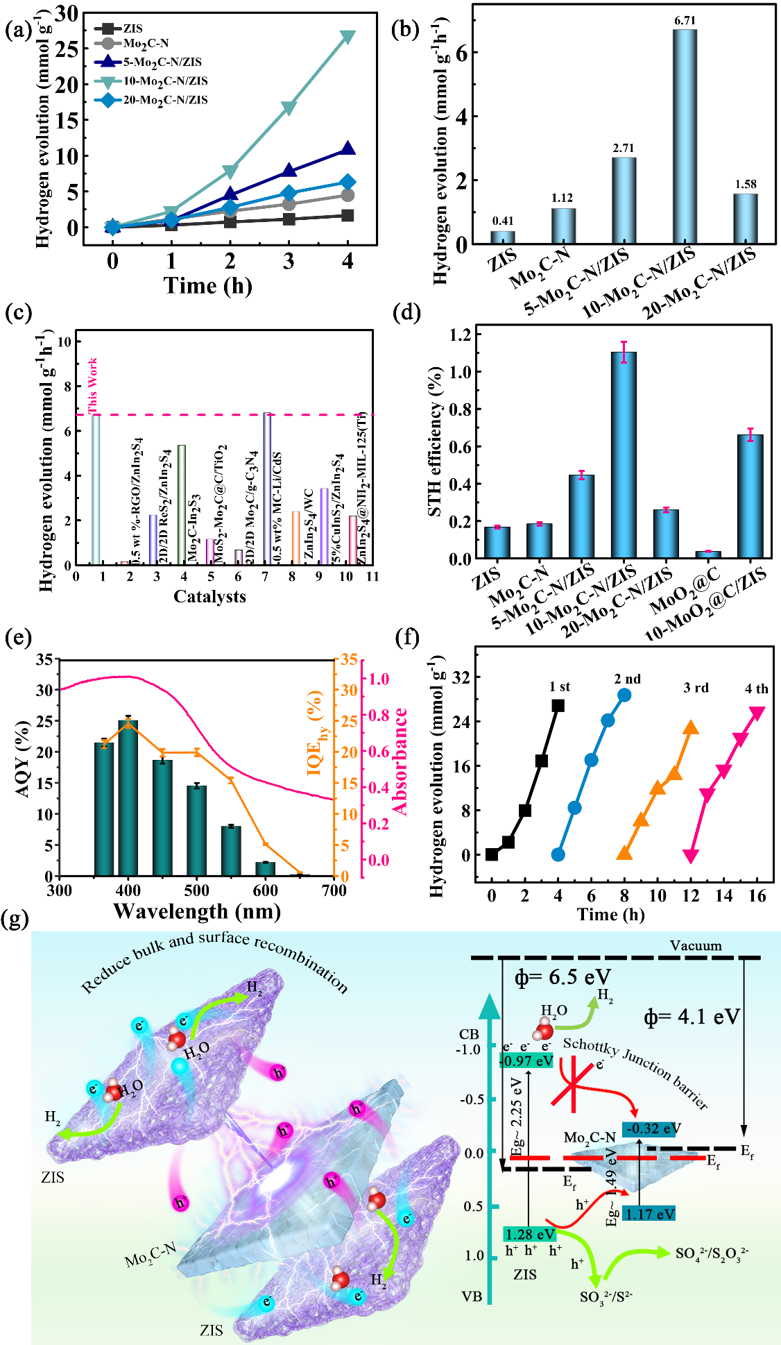 如圖9所示,Mo2C-N/ZIS光催化劑的光催化產(chǎn)氫可高達(dá)6.71 mmol g-1·h-1, 分別是純ZIS的16.4倍和Mo2C-N的6.0倍,并且高于目前文獻(xiàn)報(bào)道的同類反應(yīng)催化活性。Mo2C-N/ZIS催化劑的太陽(yáng)能氫轉(zhuǎn)換(STH)效率高達(dá)1.11%,表觀量子產(chǎn)率實(shí)現(xiàn)了25.06%在入射光波長(zhǎng)為400 nm. 這一明顯地提升的催化性能和穩(wěn)定性的實(shí)現(xiàn),得益于Mo2C-N/ZIS的合適能帶結(jié)構(gòu),更寬的光譜響應(yīng)范圍和更高的光生電子分離效率。根據(jù)密度泛函理論(DFT)結(jié)果,ZIS的功函數(shù)(6.5?eV)大于半導(dǎo)體Mo2C-N的功函數(shù)(4.1?eV), Mo2C-N和ZIS耦合后,由于界面肖特基勢(shì)壘的作用,ZIS導(dǎo)帶附近的光生電子很難沿肖特基結(jié)遷移到Mo2C-N表面,而ZIS價(jià)帶的光生空穴可以轉(zhuǎn)移到Mo2C-N表面,形成空間電荷分離區(qū)域。此外,表面或體電荷在肖特基結(jié)下有效地抑制了重組,這為H2O的分解和表面氧化還原反應(yīng)提供了更多的活化位點(diǎn)。更重要的是,引入的N原子修飾和調(diào)節(jié)了Mo2C的電子結(jié)構(gòu),激活了邊緣Mo,為捕獲高活性的富Mo邊緣原子作為高效PHE提供了潛在的支撐。
