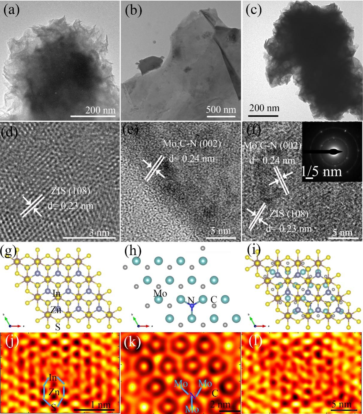此外,通過透射電鏡(TEM)進(jìn)一步分析證明了超薄2D納米片自組裝成多孔花狀的ZIS,并均勻地封裝在2D Mo2C-N表面。高分辨率透射電鏡(HRTEM)顯示,Mo2C-N/ZIS的晶格條紋分別對(duì)應(yīng)為ZIS (108)晶面和Mo2C-N 的(002)晶面。此外,我們進(jìn)一步利用掃描透射電子顯微鏡(QSTEM)模擬軟件對(duì)ZIS、Mo2C-N和Mo2C-N/ZIS的STEM圖像進(jìn)行模擬,以深入了解界面結(jié)構(gòu)關(guān)系。在ZIS, Mo2C-N的STEM圖像中可以清楚地觀察到原子的排列。對(duì)于Mo2C-N/ZIS,表面ZIS的原子排列位點(diǎn)受到明顯影響,這表明Mo2C-N助催化劑的誘導(dǎo)不僅可以改變微觀形貌,還可以影響反應(yīng)活性位點(diǎn)。
