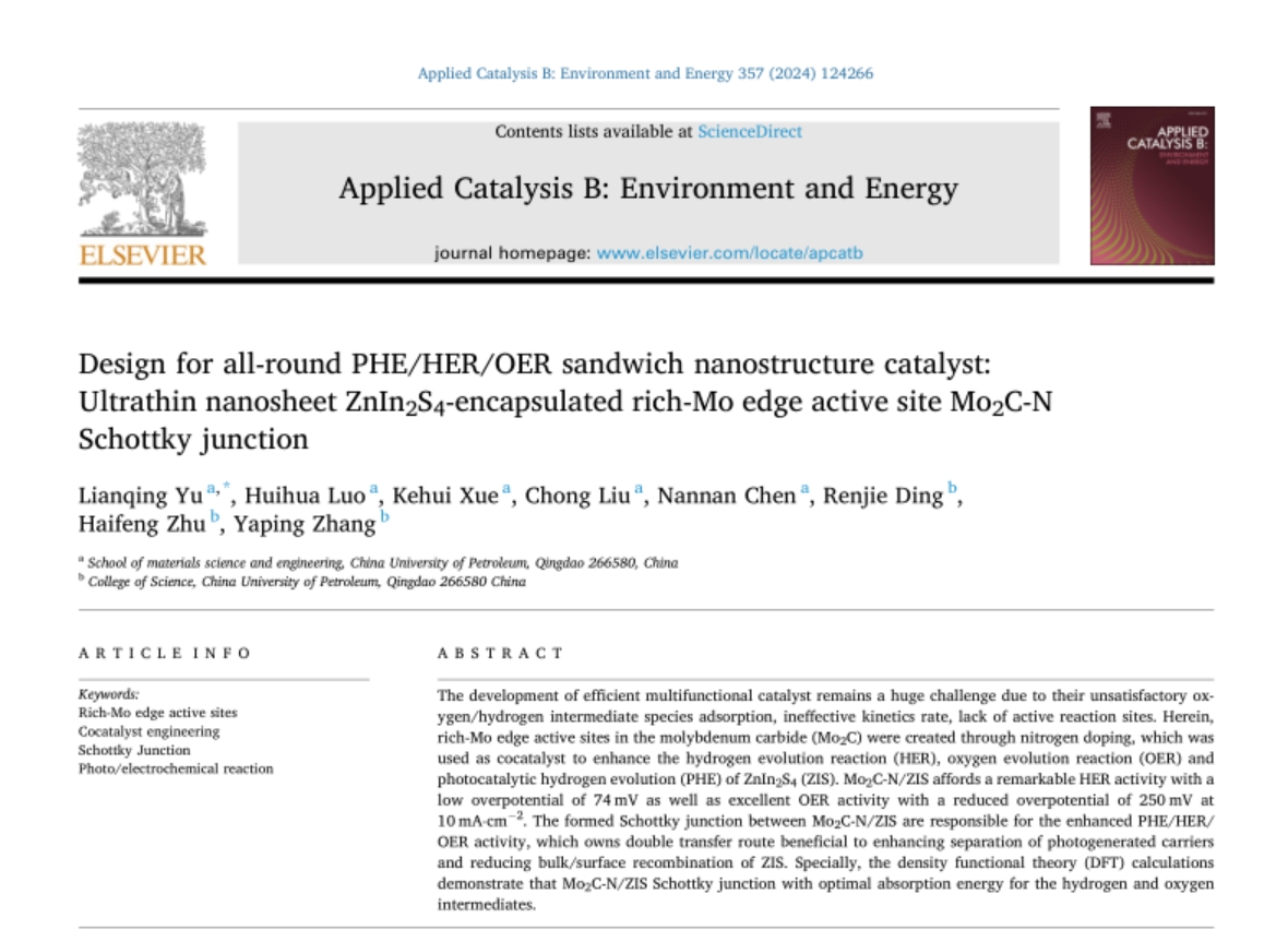 標(biāo)題: Ultrathin nanosheet ZnIn2S4-Encapsulated Rich-Mo Edge Active Site Mo2C-N Schottky Junction