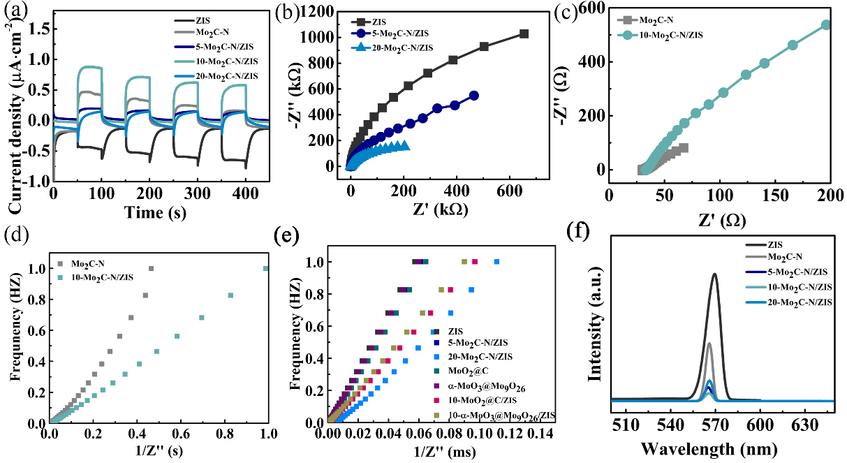如圖8所示,電化學(xué)測(cè)試中,10-Mo2C-N/ZIS 表現(xiàn)出了令人印象深刻的性能,其電流密度遠(yuǎn)高于純的ZIS和Mo2C-N,且其EIS的半圓半徑最小,表明Mo2C-N/ZIS肖特基結(jié)實(shí)現(xiàn)了有效地界面電荷轉(zhuǎn)移和傳輸。另一方面,Mo2C-N/ZIS肖特基結(jié)夾層納米結(jié)構(gòu)的穩(wěn)態(tài)光致發(fā)光(PL)猝滅效果顯著,進(jìn)一步證明其有效地建立了ZIS與Mo2C-N界面的電子傳遞渠道。