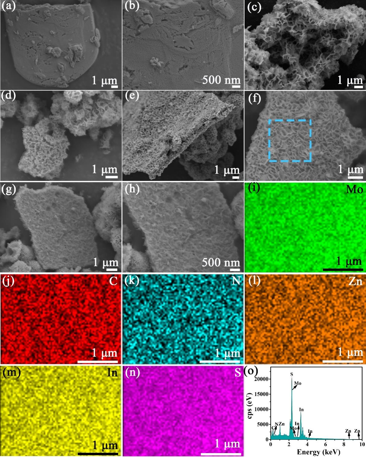 如圖2-5所示,通過SEM表征發(fā)現(xiàn),在不加任何碳源下,MoO3在高溫下相轉(zhuǎn)換得到的a-MoO3@Mo9O26呈現(xiàn)表面光滑的二維納米片層。而Mo2C-N在高溫和Ar氣氛下煅燒時(shí),構(gòu)建了豐富的微觀孔隙結(jié)構(gòu),表明微觀形貌和活性位點(diǎn)可以通過相變過程和碳源進(jìn)行調(diào)節(jié)。Mo2C-N/ZIS呈現(xiàn)出具有周期性蜂窩孔結(jié)構(gòu)的夾層納米結(jié)構(gòu),形成了良好的異質(zhì)界面,充分利用了Mo2C-N/ZIS夾層納米結(jié)構(gòu)的優(yōu)勢(shì),促進(jìn)了載流子在催化劑中的快速傳遞(圖2(e-f))。此外,在10-a-MoO3@Mo9O26/ZIS和10-MoO2@C/ZIS中出現(xiàn)了較大的孔隙結(jié)構(gòu)和界面網(wǎng)絡(luò)結(jié)構(gòu)的缺失,導(dǎo)致電子傳遞的能量壘增強(qiáng)(圖S4(a-c))。