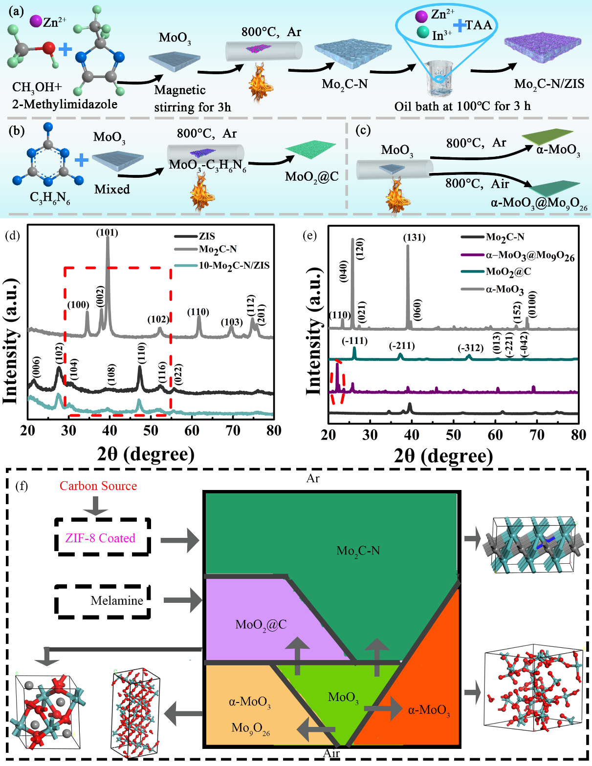 本文先通過熱處理得到Mo2C-N, 并結(jié)合油浴法將超薄ZIS納米片封裝在二維的Mo2C-N表面??紤]到碳源和非均相的影響,采用鋅基沸石型金屬有機(jī)骨架(ZIF-8)或三聚氰胺包覆的MoO3在氬(Ar)氣氛下高溫碳化以控制相轉(zhuǎn)化過程(圖1(a-c))。如圖1(d-e)所示,XRD結(jié)果表明MoO3-ZIF-8和MoO3-C3H6N6最終分別轉(zhuǎn)化為Mo2C-N和碳包覆二氧化鉬(MoO2@C)。圖1(f)解釋了在不同氣氛和條件下,MoO3在高溫相轉(zhuǎn)換過程形成的晶體結(jié)構(gòu)。