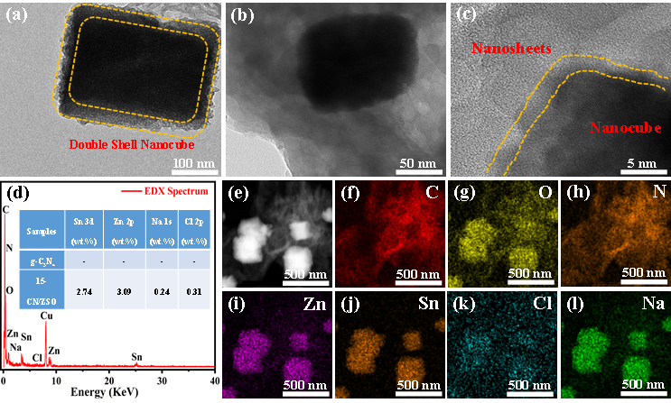 圖3a顯示了在黃色虛線中突出顯示的雙殼納米立方體ZnSnO3。圖3b和圖3c展示了制備的15-CN/ZSO異質(zhì)結(jié)構(gòu)緊密相連。圖3d-l展示了15-CN/ZSO復(fù)合物的EDX和元素映射圖,驗證異質(zhì)結(jié)構(gòu)合成中使用的所有元素的存在,且二維/三維異質(zhì)結(jié)構(gòu)的構(gòu)建成功。