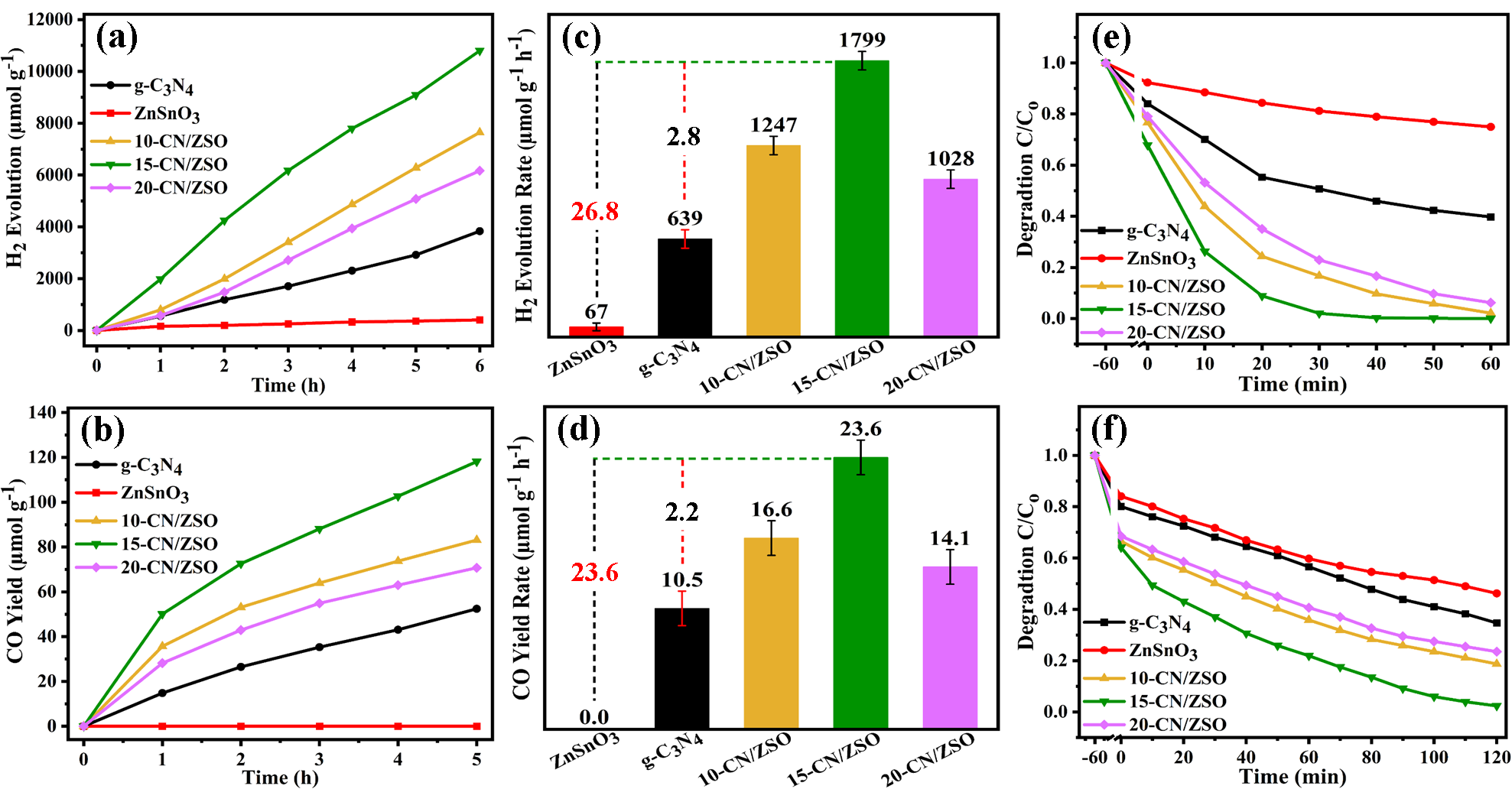 圖7.(a,b) g-C3N4、ZnSnO3和X-CN/ZSO的光催化H2演化和CO2還原,(c,d)制備材料每小時的演化速率(e) MB的光催化降解(f)抗生素四環(huán)素(TC)的光催化降解。