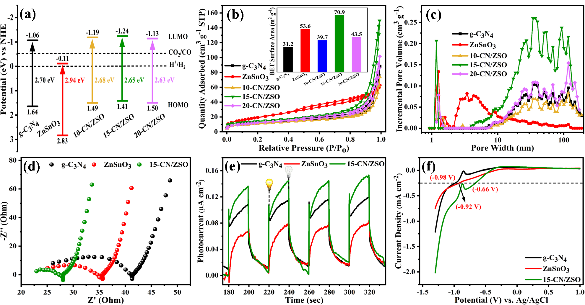 圖5. (a)制備樣品的CB和VB電位,(b)吸附-解吸等溫線,(c)孔徑分布,(d) EIS,(e)光電流,(f) LSV圖。