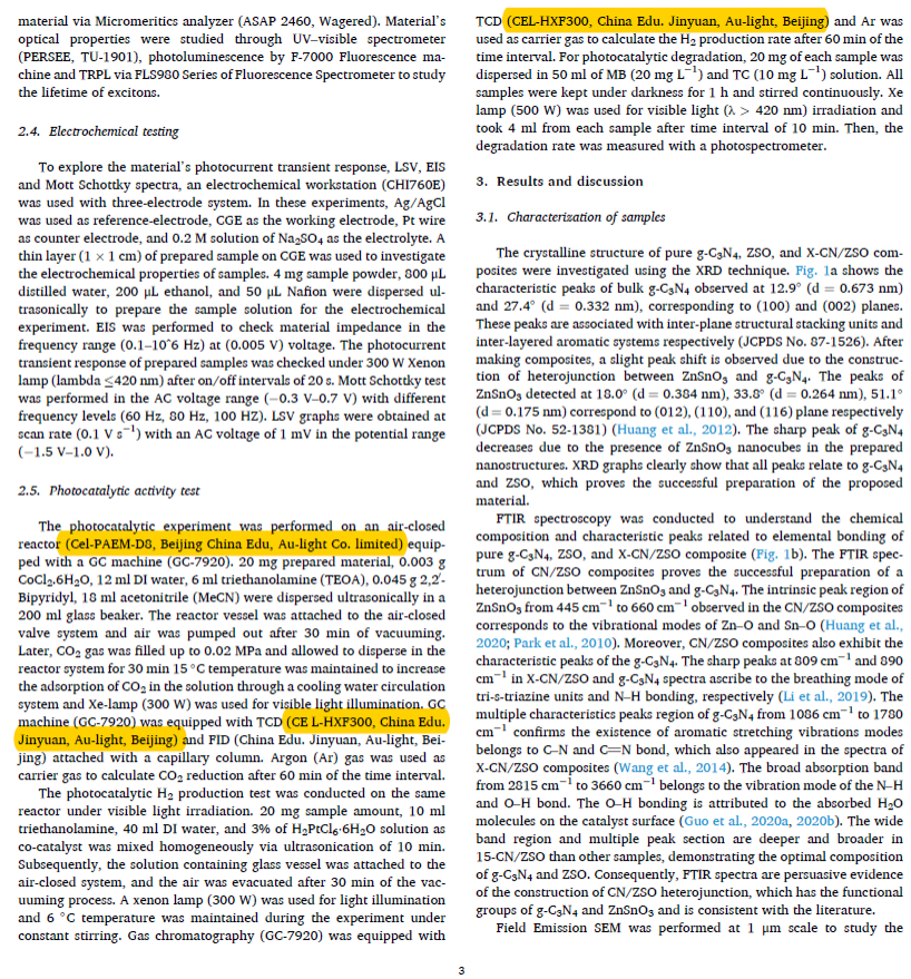 光源型號:北京中教金源CEL-HXF300(300 W氙燈);CEL-PAEM-D8plus (GC-7920)光催化評價系統(tǒng);