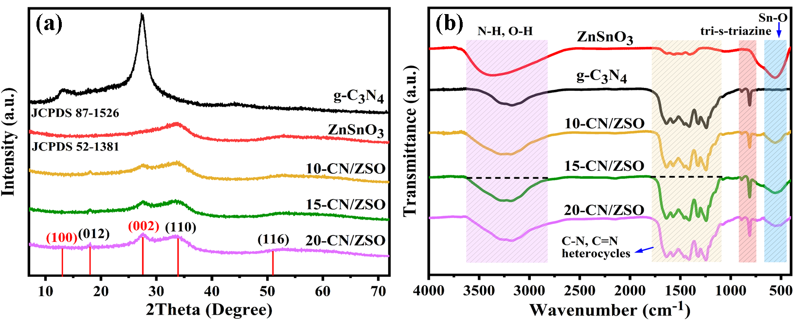 圖1a g-C3N4的特征峰對應(yīng)于(100)和(002)平面,分別與平面間的結(jié)構(gòu)堆疊單元和層間芳香結(jié)構(gòu)有關(guān)。在18.0、33. 8和51.1處檢測到的ZnSnO3的峰分別對應(yīng)于(012)(110)和(116)平面。在CN/ZSO復(fù)合材料中的ZnSnO3的內(nèi)在峰區(qū)域從445 cm-1到660cm-1對應(yīng)于Zn-O和Sn-O的振動模式。由于ZnSnO3和g-C3N4之間異質(zhì)結(jié)的形成,觀察到峰位略有偏移。此外,CN/ZSO復(fù)合材料還顯示出g-C3N4的特征峰。CN/ZSO 復(fù)合材料被FTIR光譜證明g-C3N4 呈現(xiàn)納米片狀結(jié)構(gòu)(圖2a和圖2d)。ZnSnO3是表面粗糙的立方體結(jié)構(gòu)(圖2b和圖2e)集中在400-600nm范圍內(nèi)。它們形成了二維/三維的CN/ZSO (g-C3N4/ZnSnO3)異質(zhì)結(jié)(圖2c和圖2f),g-C3N4和ZnSnO3的界面連接提供了較大的接觸面積,增強了內(nèi)部電場縮短光生載流子的電子路徑。這種異質(zhì)結(jié)由于兩種形態(tài)材料之間的界面連接,促進了快速電荷遷移。