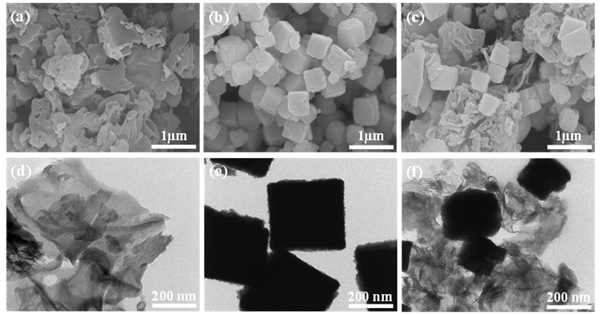 圖2. (a,d)g-C3N4、(b,e)ZnSnO3、(c f) 15-CN/ZSO分別為SEM和TEM圖。