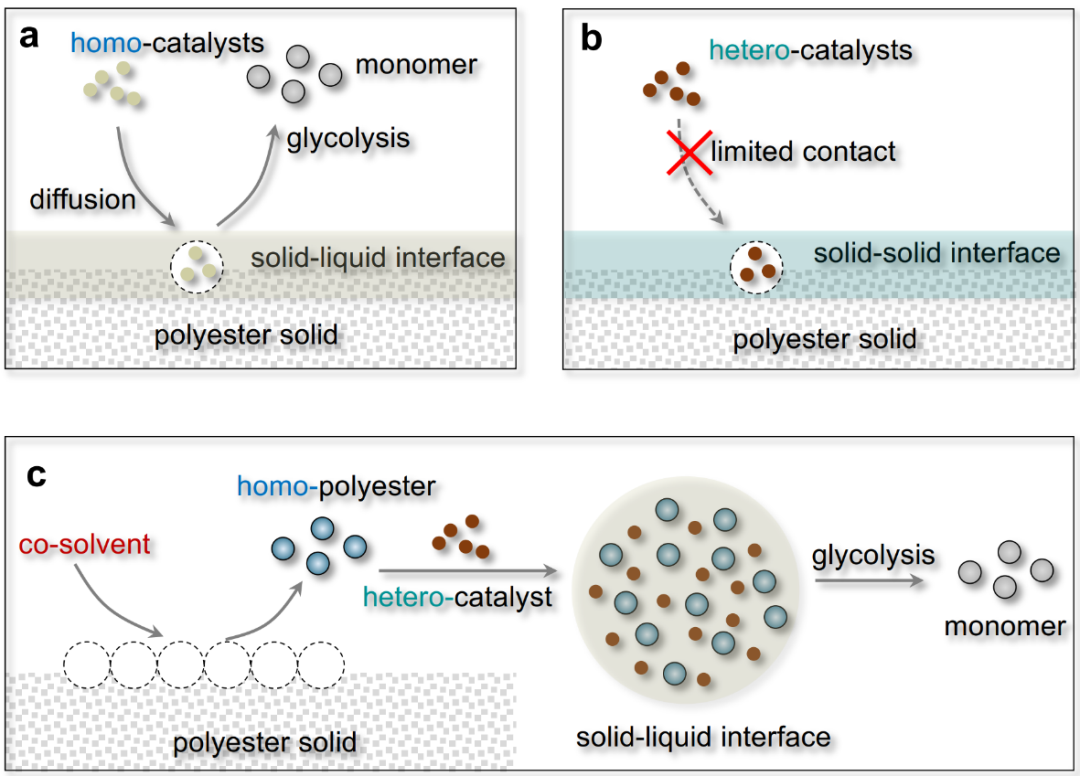 如圖1所示,作者設(shè)計了通過引入助溶劑的方法來有效解決異相催化體系中的多相界面?zhèn)髻|(zhì)難題,進而克服不同聚酯在溶解和擴散動力學(xué)上的限制。此外,通過開發(fā)高效異相催化劑進一步提升混合聚酯塑料的回收效率和選擇性。