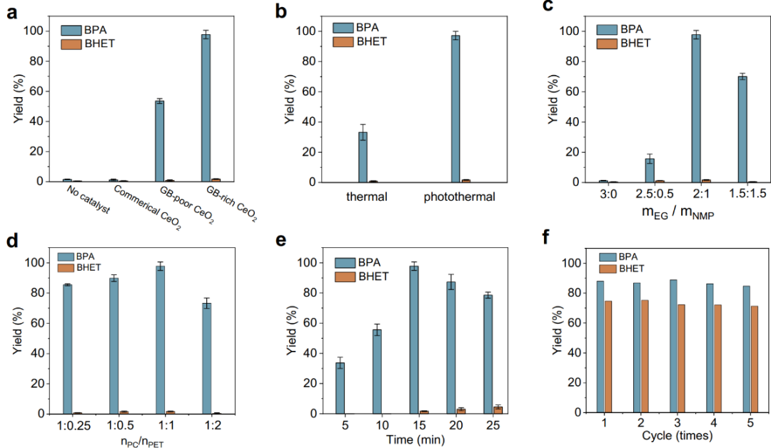 如圖5所示,作者還利用GB-rich CeO2催化劑,通過光熱催化將真實的PET和PC混合塑料梯次解聚為BPA和BHET。