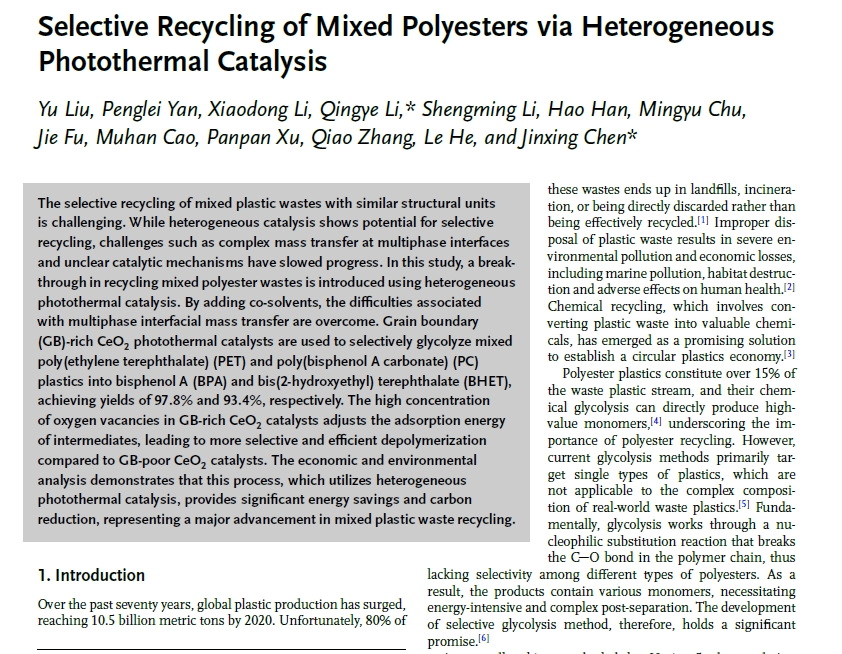 《文章投稿》異相光熱催化選擇性回收混合聚酯塑料
