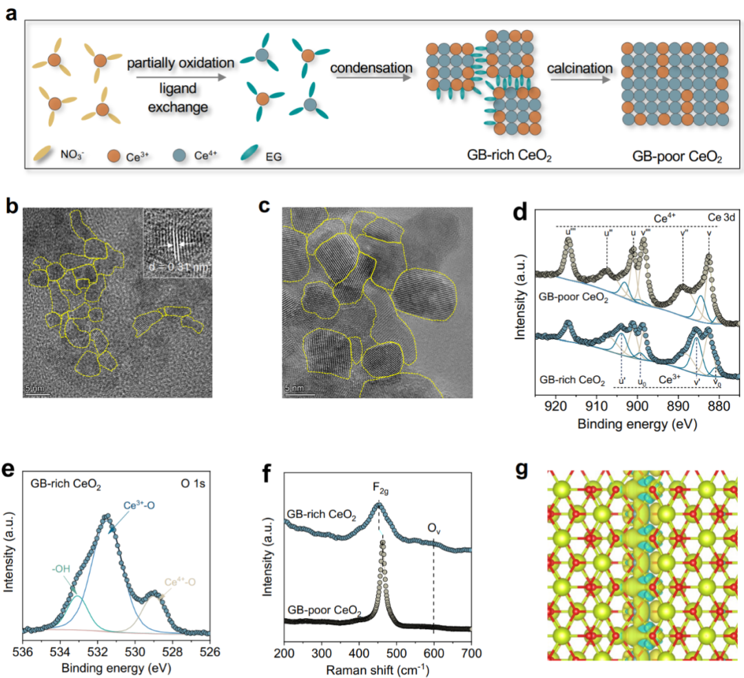 圖2. GB-rich CeO2納米顆粒的合成和結(jié)構(gòu)表征。