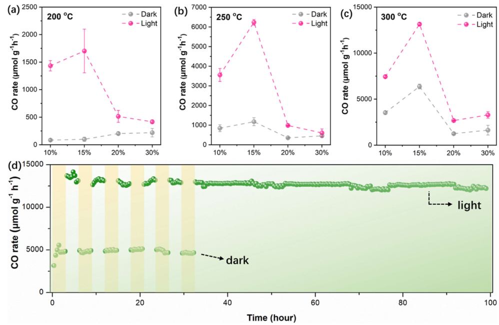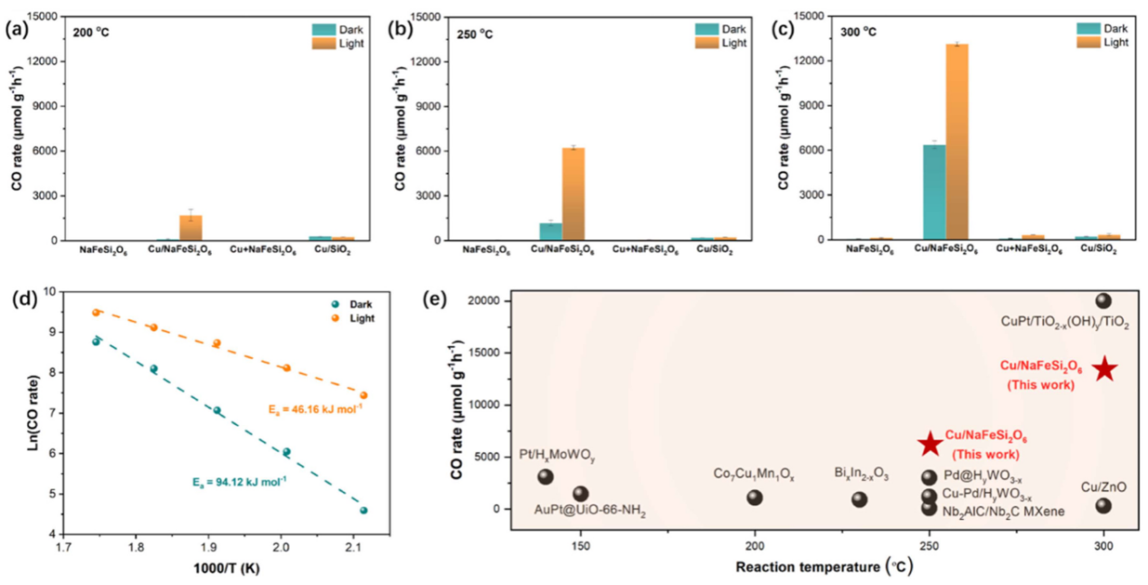 在流動相微反裝置測試了催化劑的光催化CO2加氫性能(圖3)。在200,250以及300 °C反應溫度下,Cu/NaFeSi2O6催化劑表現(xiàn)出逐漸增強的CO生成速率,且光響應顯著。同等反應條件下,Cu/NaFeSi2O6催化劑的催化活性顯著優(yōu)于單一催化劑、物理混合催化劑以及Cu/SiO2對比催化劑。在300 °C 加光條件下,Cu/NaFeSi2O6催化劑的CO生成速率達到最大值,優(yōu)于大多數(shù)當前報道的催化劑。進一步,我們考察了不同Cu負載量的影響,發(fā)現(xiàn)15%Cu負載效果最佳,這可能是由于該負載濃度能夠得到具有最佳Cu顆粒大小和分散度的催化劑。該催化劑在反復光照開/關以及長時間活性測試條件下保持良好催化活性,顯示出優(yōu)異的活性穩(wěn)定性(圖4)。