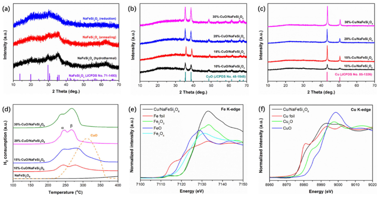 通過XRD可以看出經(jīng)過水熱、煅燒以及還原處理,能夠成功制備Cu/NaFeSi2O6催化劑(圖2),H2-TPR進一步證實CuO負載的NaFeSi2O6催化劑由于金屬/載體界面作用,有利于CuO的分解還原(相比純CuO,CuO/NaFeSi2O6還原溫度降低)。同步輻射結果顯示,Cu/NaFeSi2O6催化劑中的Fe物種譜線與Fe2O3參比相似,表明Fe是以+3價存在;但是,兩者散射峰仍存在差異,說明Fe3+在NaFeSi2O6和Fe2O3中的配位環(huán)境不同。同樣,同步輻射和XPS結果表明Cu是以金屬態(tài)形式存在的。