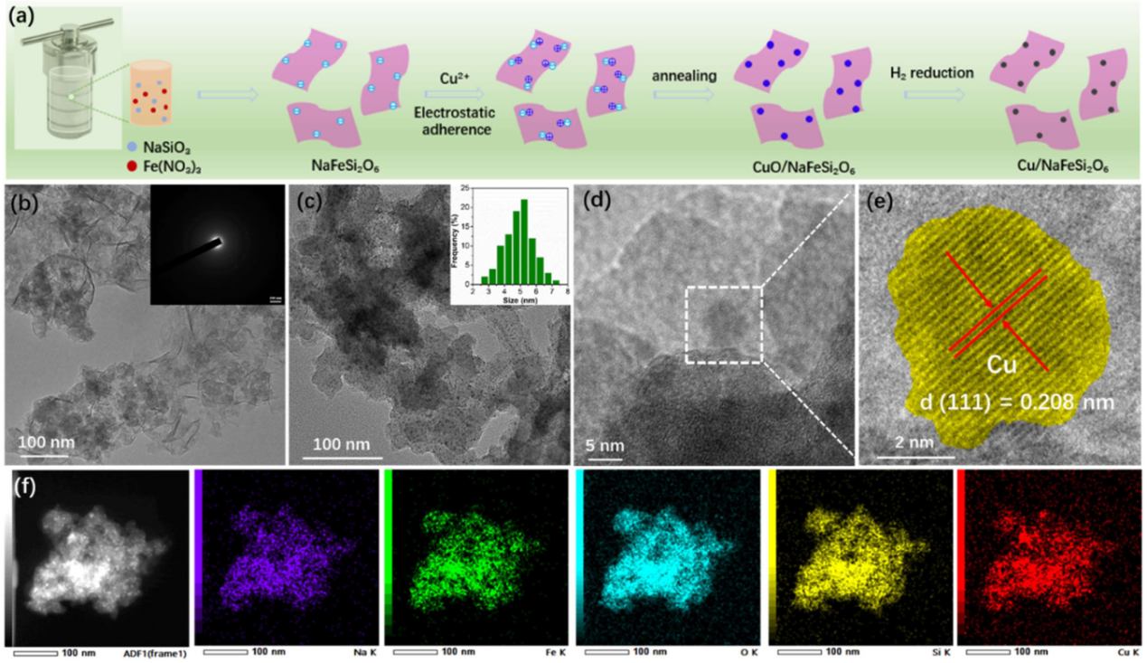 本文采用水熱法先制備出NaFeSi2O6納米片,再將Cu2+通過靜電吸附作用錨定在納米片表面,隨后經(jīng)歷煅燒和還原合成出Cu/NaFeSi2O6催化劑(圖1)。TEM、HRTEM以及mapping可以看出Cu納米顆粒高度分散在NaFeSi2O6納米片表面,兩者具有強的界面相互作用。