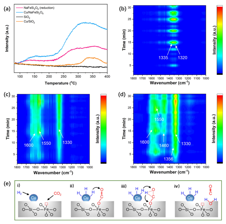 除了電子能帶結構,Cu/NaFeSi2O6催化劑優(yōu)異的光催化性能也受其表面活性位點的影響(圖6)。ESR光譜表明直接水熱合成的NaFeSi2O6沒有氧空位信號,而H2還原后以及Cu負載的催化劑均具有氧空位信號,與O 1s XPS結果一致。NaFeSi2O6是由SiO4四面體和FeO6八面體構成。相對而言,Si-O鍵的化學鍵能要強于Fe-O鍵,因此,在H2還原過程中,與Fe相連的O原子更容易被移除,從而使得Fe原子配位不飽和,表現(xiàn)出路易斯酸位點特征。由于金屬-氧化物的界面效應,金屬Cu負載能夠進一步增強催化性能。NH3-TPD結果可以看出,相比SiO2,NaFeSi2O6及Cu/NaFeSi2O6均表現(xiàn)出強的路易斯酸性特征。氧化物催化劑中的路易斯酸位點通常被認為是活化CO2的關鍵位點。從CO2-TPD譜圖可以看出(圖7),Cu/NaFeSi2O6具有最強的CO2脫附信號。原位紅外光譜也能進一步說明不同催化劑對CO2的活化過程,其中,Cu/NaFeSi2O6催化劑的原位光譜圖中可以看到甲酸根等關鍵中間物種。此外,Cu金屬顆粒對H2的解離以及氫溢出也能進一步促進CO2-CO的轉化。
