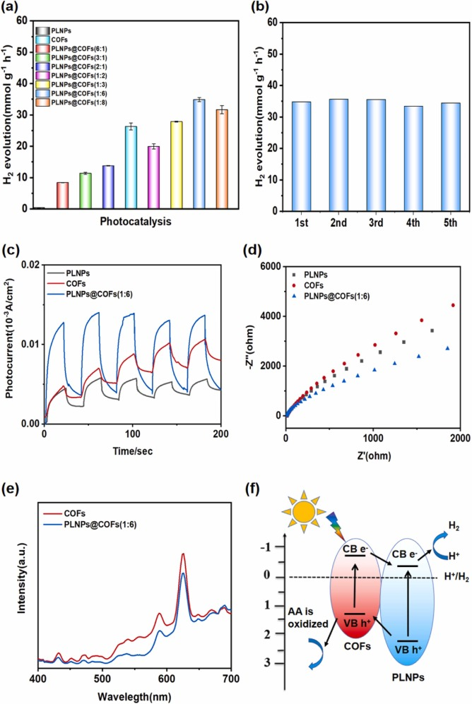 圖5 光催化制氫性能、光電化學(xué)表征分析以及制氫機理。(a) 所制備樣品的光催化 H2 演化活性;(b) PLNPs@COFs (1:6) 光催化 H2 演化的循環(huán)耐久性;(c) PLNPs、COFs 和 PLNPs@COFs (1:6) 的光電流響應(yīng)(d)和EIS Nyquist圖 (e);