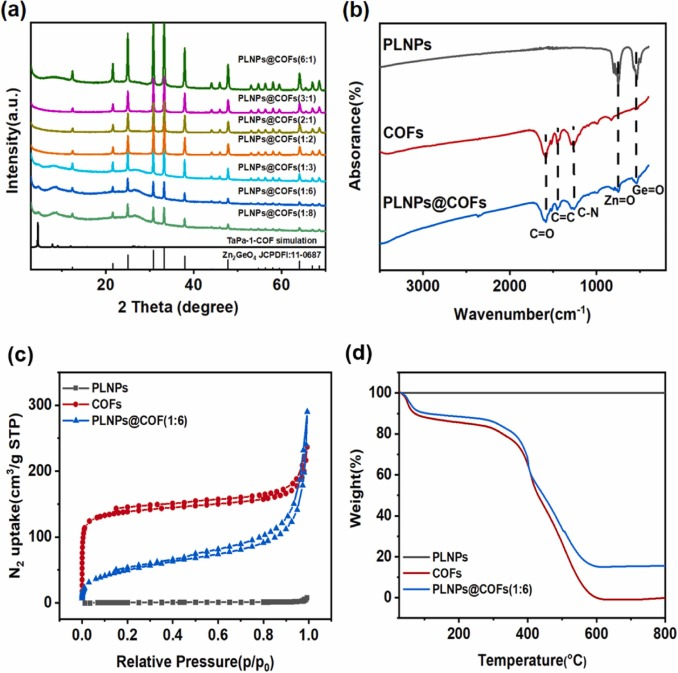 圖2物相表征。(a) PLNPs@COFs復(fù)合材料的XRD譜圖;(b) PLNPs、COFs和PLNPs@COFs的FTIR光譜;(c) PLNPs、COFs和PLNPs@COFs的N2吸附等溫線;(d) PLNPs、COFs和PLNPs@COFs的TGA曲線。