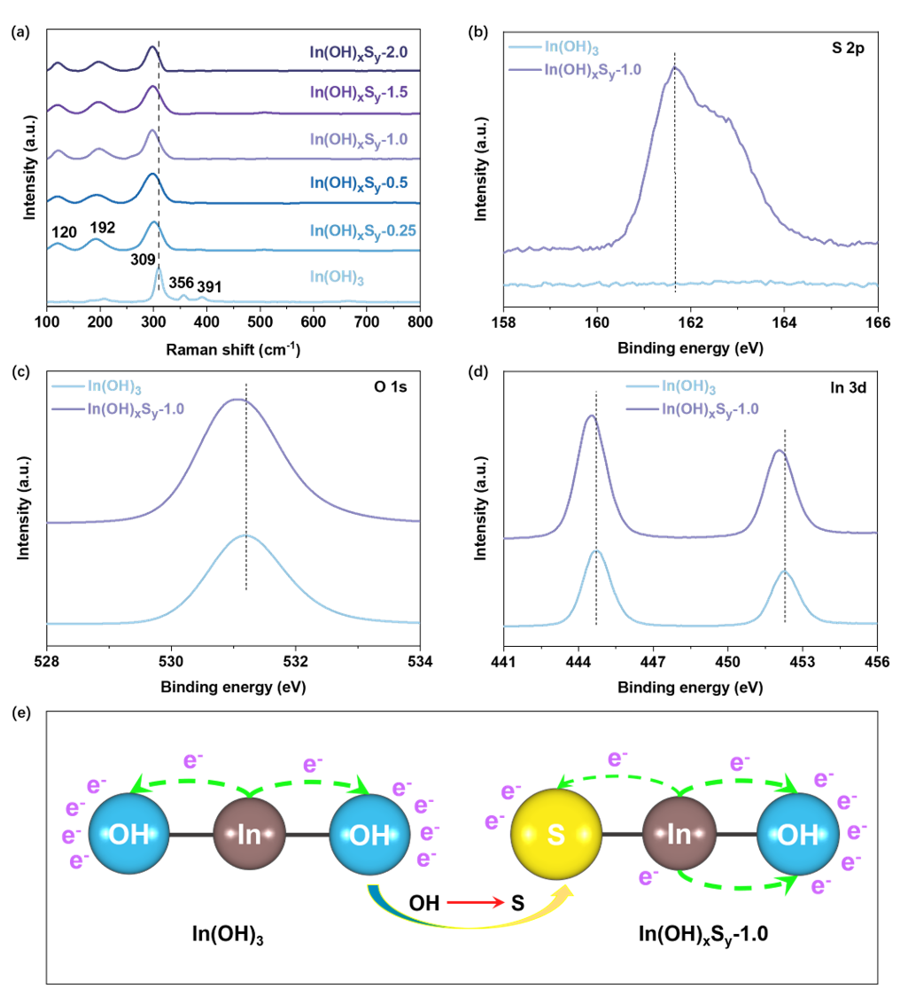 通過Raman(圖2a)可以看出,隨著雜原子硫的引入,In(OH)3內(nèi)部結(jié)構(gòu)中部分In-O鍵的消失以及S-In鍵的形成。XPS(圖2b-d)測試表明,由于電負(fù)性的差異,S2-的引入打破了破壞了對稱的OH-In-OH活性中心,形成了新的非對稱的S-In-OH電子富集活性位點(diǎn)(圖2e),進(jìn)而促進(jìn)樣品對反應(yīng)分子的潛在吸附和活化能力。