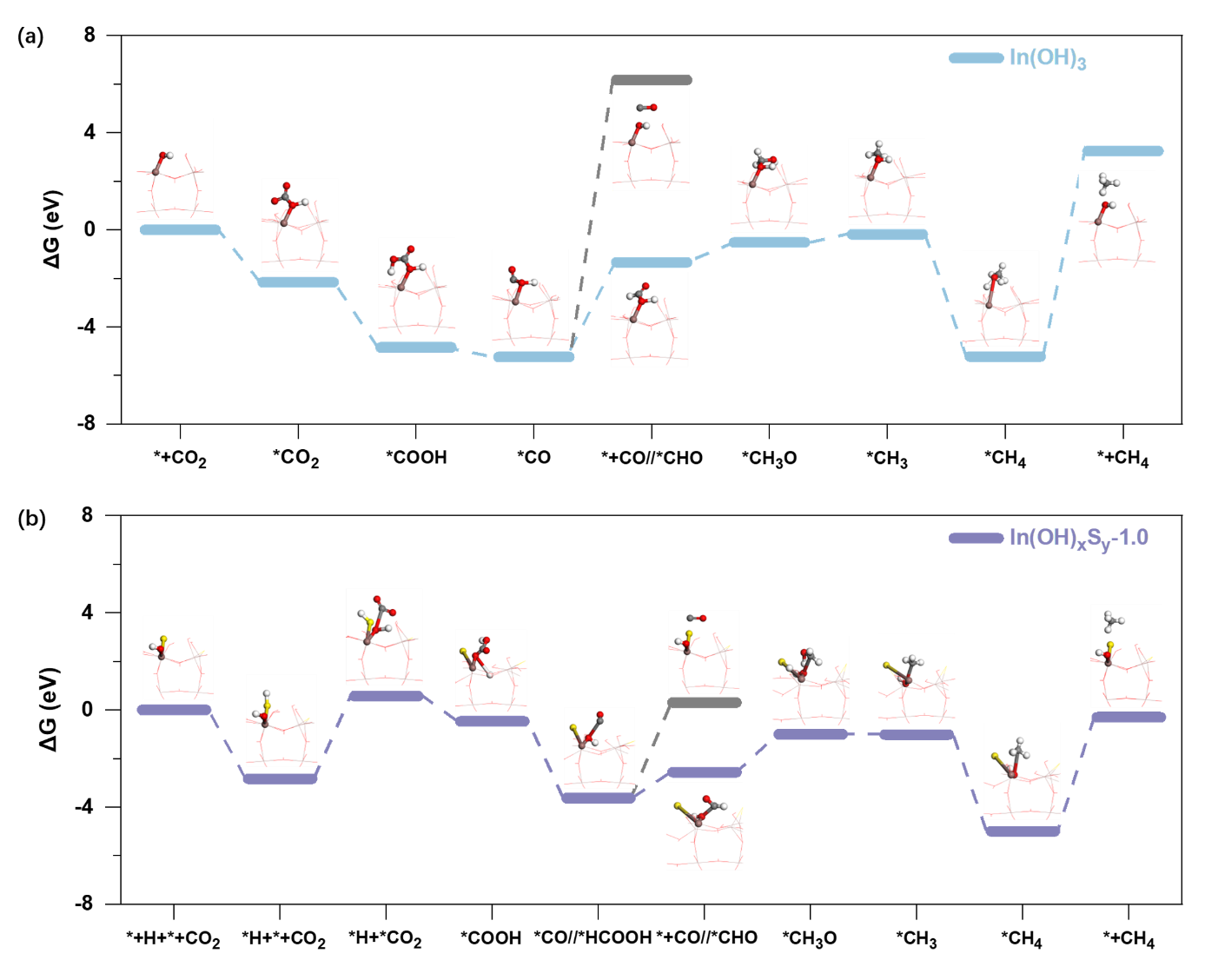 為了證實(shí)這些實(shí)驗(yàn)觀察結(jié)果,進(jìn)一步了通過構(gòu)建系列理論模型深入研究了摻雜硫原子對CO2還原過程的影響。結(jié)果發(fā)現(xiàn)(圖9),相比于在In(OH)3表面,CO2分子在In(OH)xSy-1.0表面上向CH4轉(zhuǎn)化所需要克服的熱力學(xué)能壘在整體上更低,這意味著CO2更易在在In(OH)xSy-1.0表面上發(fā)生CO2甲烷化過程。