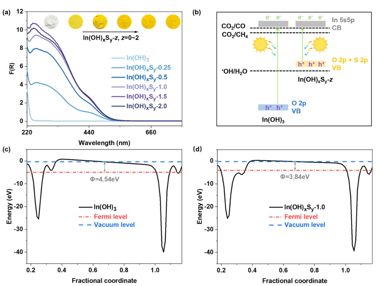 通過紫外可見漫反射光譜(圖4a-b)可知,得益于S的2p軌道對In(OH)xSy-z樣品價帶位置的有效調(diào)控,摻雜硫的引入極大地提高了In(OH)xSy-z樣品對太陽光光譜的利用率。通過理論計算分析可知,相較于In(OH)3,In(OH)xSy-1.0樣品的表面功函數(shù)更低(圖4c-d),這意味著后者表面的電子更易受到光的激發(fā)。