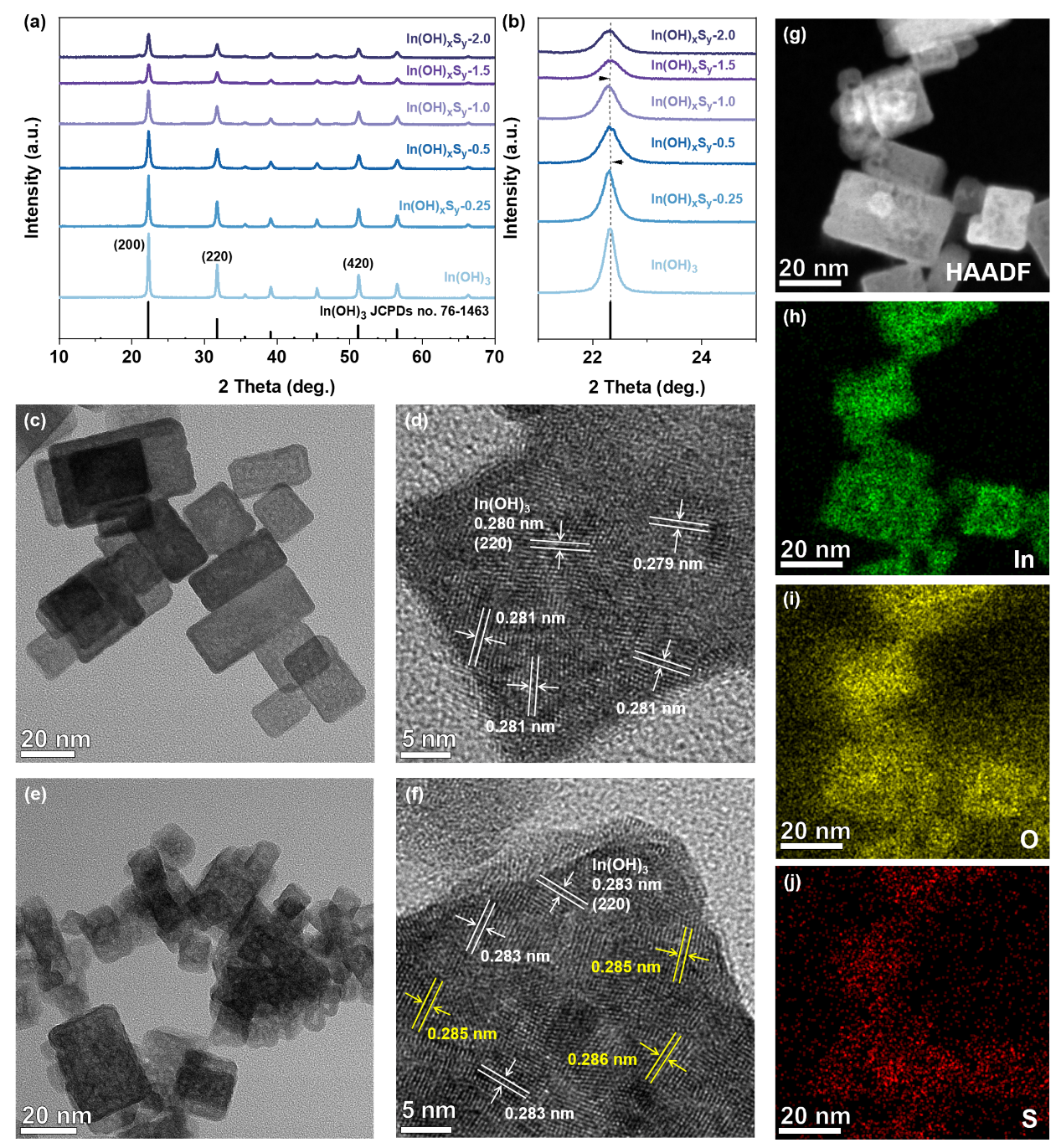 本文采用一步水熱法制備系列不同硫/銦原子比摻雜的In(OH)xSy-z樣品。XRD(圖1a-b)中衍射峰的偏移可以看出摻雜硫的成功引入。TEM、HRTEM以及mapping(圖1c-j)可以看出合成樣品呈納米立方體狀,其中硫元素均勻摻雜在立方體。