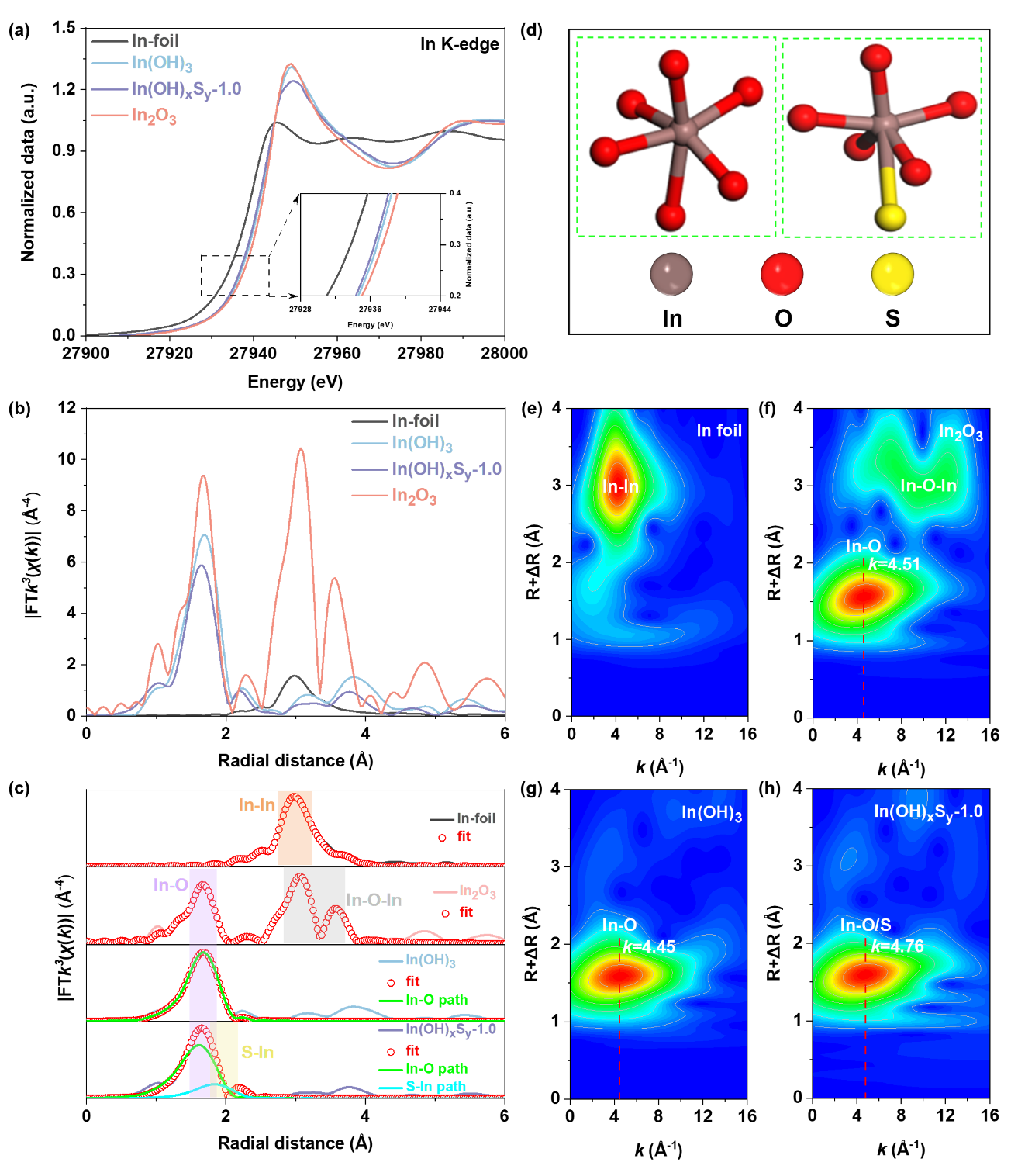 同步輻射結(jié)果顯示,In(OH)xSy-1.0樣品中的In物種譜線與In(OH)3樣品相比,前者譜線位置較后者整體往低結(jié)合能處移動(圖3a-b)。通過擬合分析可知(圖3c-3h),In(OH)xSy-1.0樣品中表現(xiàn)出S-In鍵的特征吸收峰,這進(jìn)一步證明了摻雜硫的成功引入。