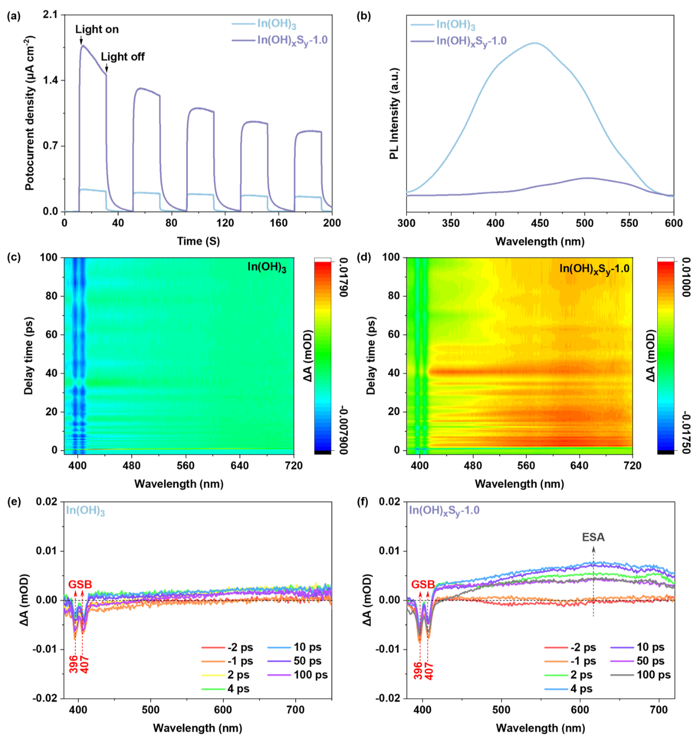 為了探究In(OH)xSy-1.0樣品光催化CO2加水還原產(chǎn)CH4性能增強(qiáng)的原因,對其動力學(xué)電荷分離性質(zhì)進(jìn)行了表征。光電流、電化學(xué)阻抗以及瞬態(tài)吸收光譜測試均表明(圖6),由于摻雜硫?qū)兜膬?yōu)化,In(OH)xSy-1.0樣品表現(xiàn)出更好的載流子分離和遷移性能。除了動力學(xué)電荷分離性質(zhì),In(OH)xSy-z樣品優(yōu)異的光催化性能也受其新引入的表面硫活性位點(diǎn)的影響。
