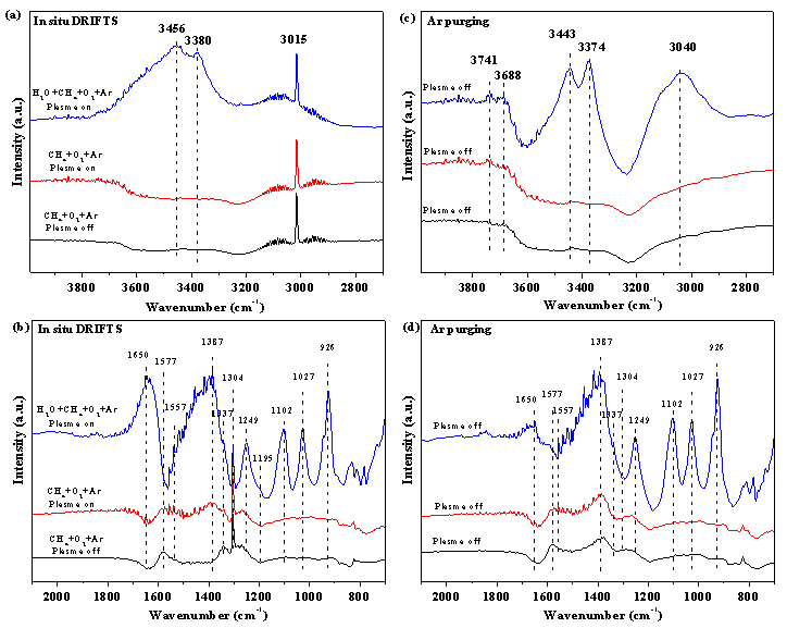 2. 等離子體原位紅外和原位原子發(fā)射光譜表征結(jié)果證明:水蒸氣促進了化學(xué)吸附的烴類物質(zhì)的選擇性氧化。