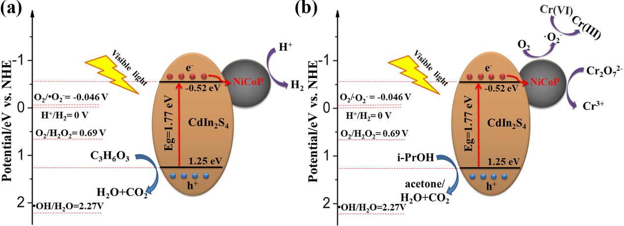 基于實(shí)驗(yàn)結(jié)果和理論計(jì)算,我們提出了可見光(λ> 420 nm)下NCP/CIS材料的光催化機(jī)理。如圖所示,由于CIS具有1.77 eV的窄帶隙,在可見光照射下,被光激發(fā)產(chǎn)生電子和空穴。由于NCP具有合適的費(fèi)米能級和優(yōu)異的導(dǎo)電性,光致電子很容易從CIS的CB遷移到NCP,它們和NCP的光致熱電子迅速將H+還原為H2。同時(shí),CIS中的空穴被C3H6O3迅速捕獲并消耗。這有效地提高了載流子的分離效率。對于Cr(VI)還原, CIS的CB中的光生電子遷移到NCP,隨后將Cr2O72-還原為Cr3+。同時(shí),NCP上的部分電子可以與O2反應(yīng)生成·O2 -,進(jìn)一步將Cr(VI)還原為Cr(III)。因此,NCP作為電子介質(zhì)有效地加速了載流子的分離和轉(zhuǎn)移,使NCP/CIS材料具有顯著提高的析氫和還原Cr(VI)的催化性能。