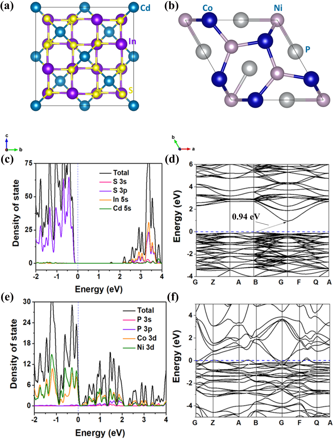 通過DFT計(jì)算了CIS與NCP的計(jì)算模型態(tài)密度、帶隙結(jié)構(gòu)和功函數(shù)。CIS的CB主要由In 5s、Cd 5s和S 3s態(tài)組成,而S 3p態(tài)則主要構(gòu)成VB態(tài)。此外,CIS是一種間接帶隙半導(dǎo)體,其計(jì)算帶隙為0.94 eV。對于NCP,費(fèi)米面位于VB內(nèi)部,以Ni 3d和Co 3d態(tài)為主。此外,NCP具有類似金屬的特性和良好的導(dǎo)電性,這有利于光誘導(dǎo)載流子的有效分離。