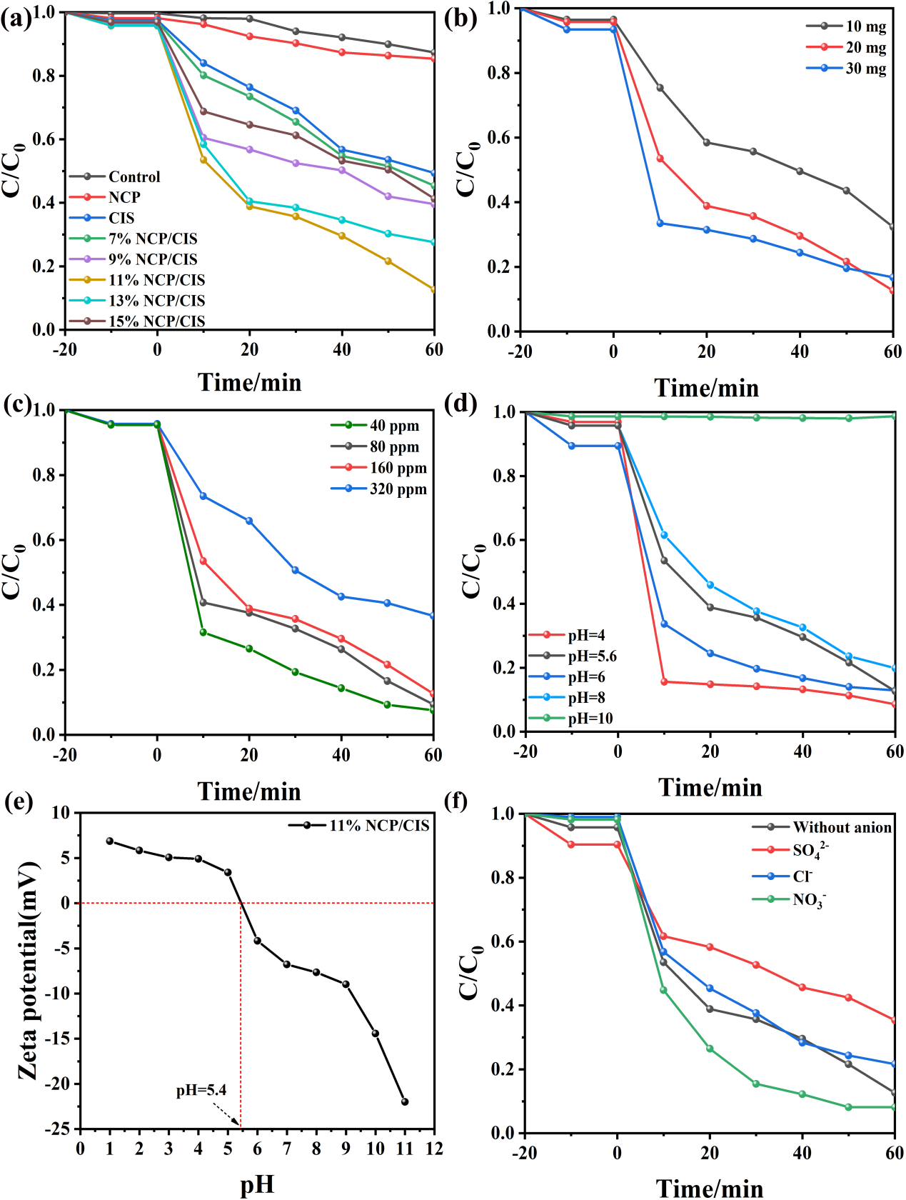 當(dāng)NCP,CIS,NCP/CIS作為光催化劑時(shí),Cr(VI)的去除率分別提高到14.64%、50.48%和88%,這意味著NCP 負(fù)載CIS提高了Cr(VI)的光降解效率。同時(shí)11% NCP/CIS的Cr(VI)去除率進(jìn)一步提高。進(jìn)一步驗(yàn)證了其優(yōu)異的催化性能。除此之外,還探究了催化劑用量,污染物濃度,pH和不同陰離子對光催化去除Cr(VI)的影響。