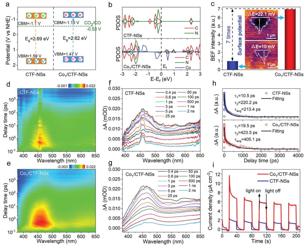 圖4 Co1/CTF-NSs的能帶結(jié)構(gòu)、PDOS圖、表面電勢圖像、fs-TA光譜和光電流曲線,這些結(jié)果表明了突出的Co極化場加速了電荷分離和轉(zhuǎn)移速率。