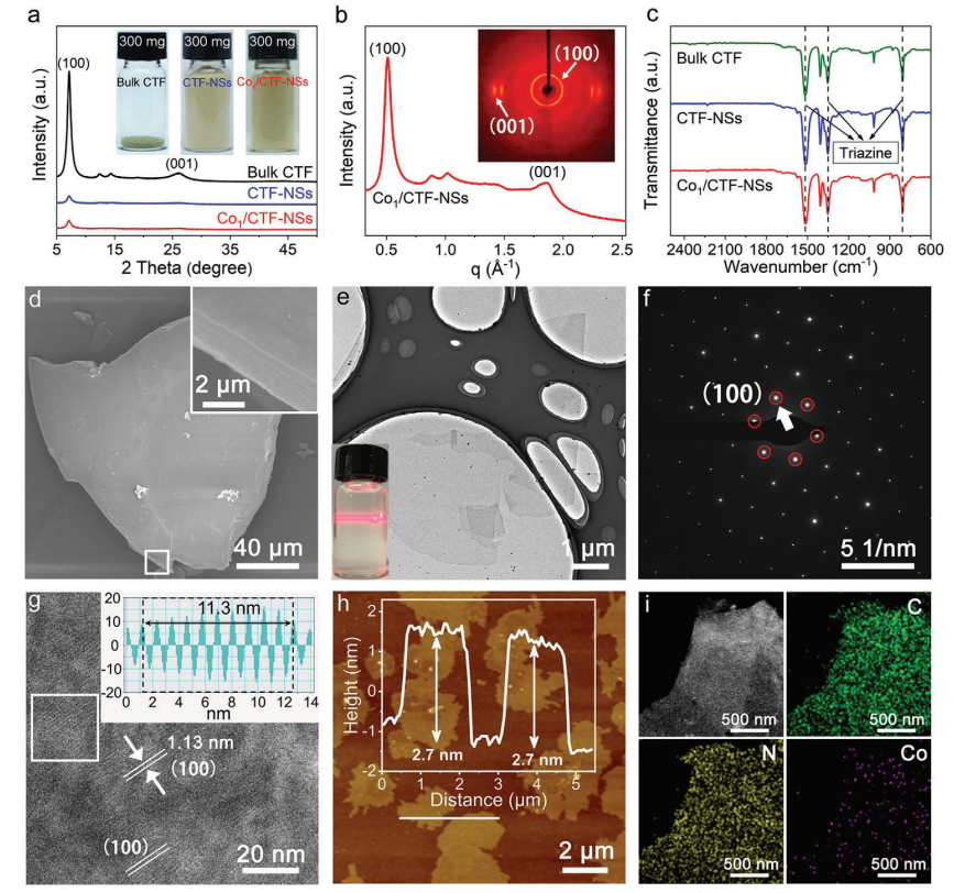 圖1 利用PXRD, 2D WAXS和FT-IR證實了Co1/CTF-NSs的晶體結(jié)構(gòu)和化學(xué)組成。利用SEM, TEM, SAED, HRTEM和AFM證實了Co1/CTF-NSs的形貌。