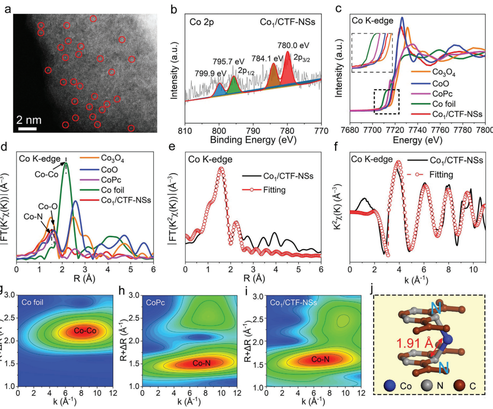 圖2 通過(guò)AC-HAADF-STEM,XPS光譜展示了Co單原子在Co1/CTF-NSs中的分散和化學(xué)狀態(tài),XAFS分析揭示了Co原子的確切原子結(jié)構(gòu)和配位環(huán)境。