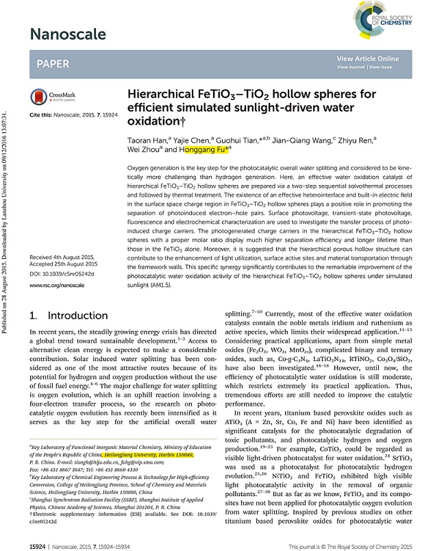 當(dāng)前位置 : 首頁 > 資訊動態(tài) > 論文發(fā)表 > Hierarchical FeTiO3-TiO2 hollow spheres for efficient simulated sunlight-driwen water oxidation