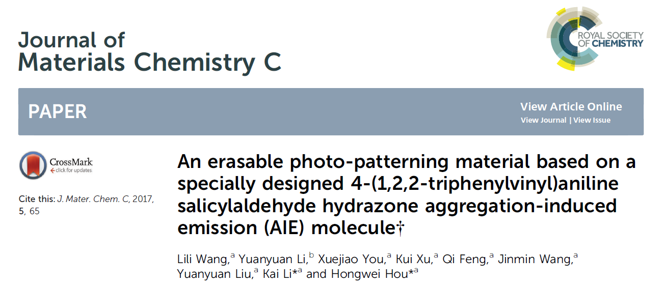 當前位置 : 首頁 > 資訊動態(tài) > 論文發(fā)表 > An erasable photo-patterning material based on a specially designed 4-(1,2,2-triphenylvinyl)aniline salicylaldehyde hydrazone aggregation-induced emis