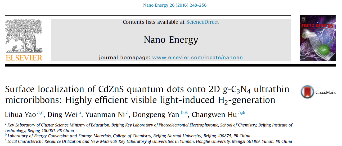 當前位置 : 首頁 > 資訊動態(tài) > 論文發(fā)表 > Surface localizationofCdZnSquantumdotsonto2D g-C3N4 ultrathin microribbons:Highlyefficient visiblelight-inducedH2-generation
