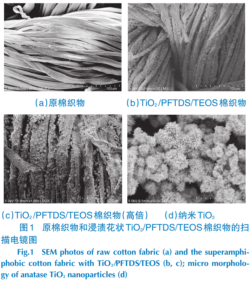 GUO等人[16]通過在棉織物表面包覆蓬松的球形 SiO2納米顆粒,再進(jìn)一步用低表面能材料含氟化合物改性,獲得雙層微/納米結(jié)構(gòu)的多功能超拒液棉織物。TiO2因優(yōu)異的光電化學(xué)特性和經(jīng)濟(jì)效益高[17-18],在紡織領(lǐng)域常用于光催化降解有機(jī)污染物,以及抗菌和抗紫外線產(chǎn)品[19-20]??椢锉砻娉练eTiO2納米顆粒的研究不在少數(shù),但對多層次的TiO2與含氟低表面能材料共摻雜構(gòu)筑的超雙疏與光催化棉織物的研究還沒有報道。