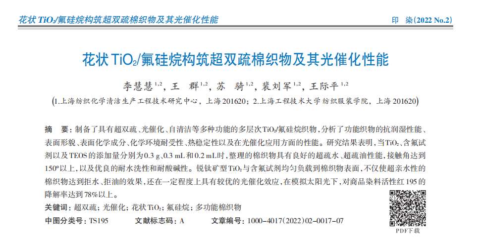 中文標(biāo)題: 花狀TiO2/氟硅烷構(gòu)筑超雙疏棉織物及其光催化性能