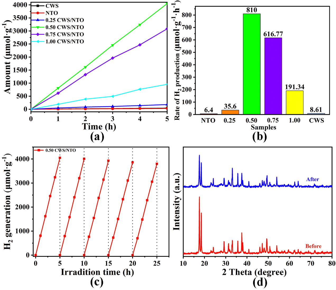 2、通過調(diào)控Cu2WS4的含量,0.50 Cu2WS4/NiTiO3具有最佳的催化活性,產(chǎn)氫量為810 μmol·g-1·h?1,420 nm處的AQE 為1.65 %。
