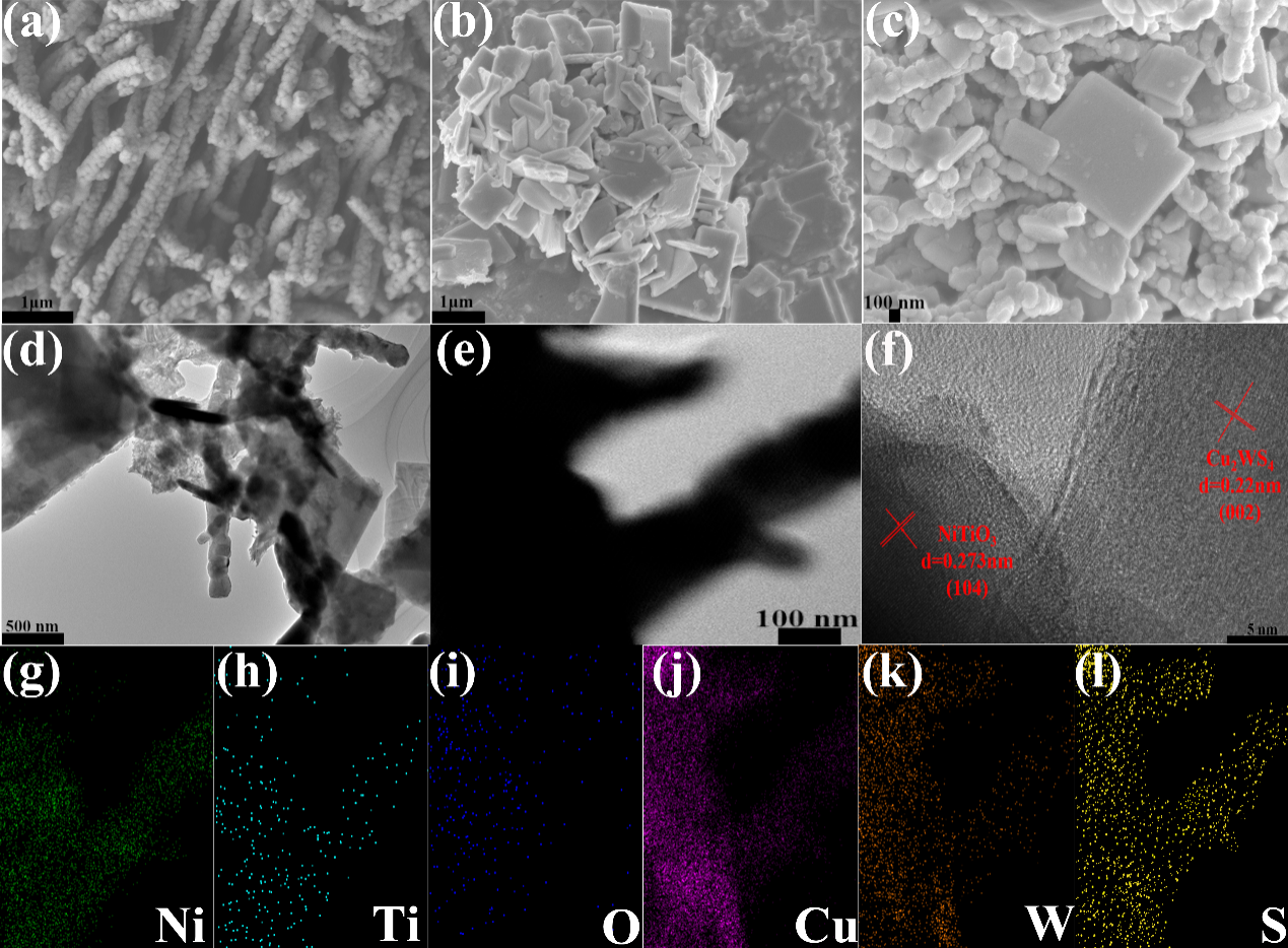 通過SEM和TEM可得到NiTiO3、Cu2WS4和0.50 Cu2WS4/NiTiO3材料的形貌和微觀結構特征。在圖2a中,純NiTiO3表現(xiàn)出典型的一維納米纖維結構,具有粗糙和多孔的特征。如圖2b所示,Cu2WS4是二維正方形納米片,表面清晰光滑。圖2c顯示,0.50 Cu2WS4/NiTiO3保持了NiTiO3和Cu2WS4的部分形貌,兩個組分形成了緊密的接觸。然而,在水熱過程中,其形貌受到了一定程度的破壞。使用TEM圖像進一步驗證了所制備的復合材料的微觀結構(圖2(d-f))。此外,0.50 Cu2WS4/NiTiO3的元素能譜圖證實了Ni、Ti、O、Cu、W和S元素的存在(圖2(g-l)),證明各元素在復合材料中的均勻分散以及NiTiO3和Cu2WS4的緊密結合,這有利于提高光生電子-空穴對的分離能力。
