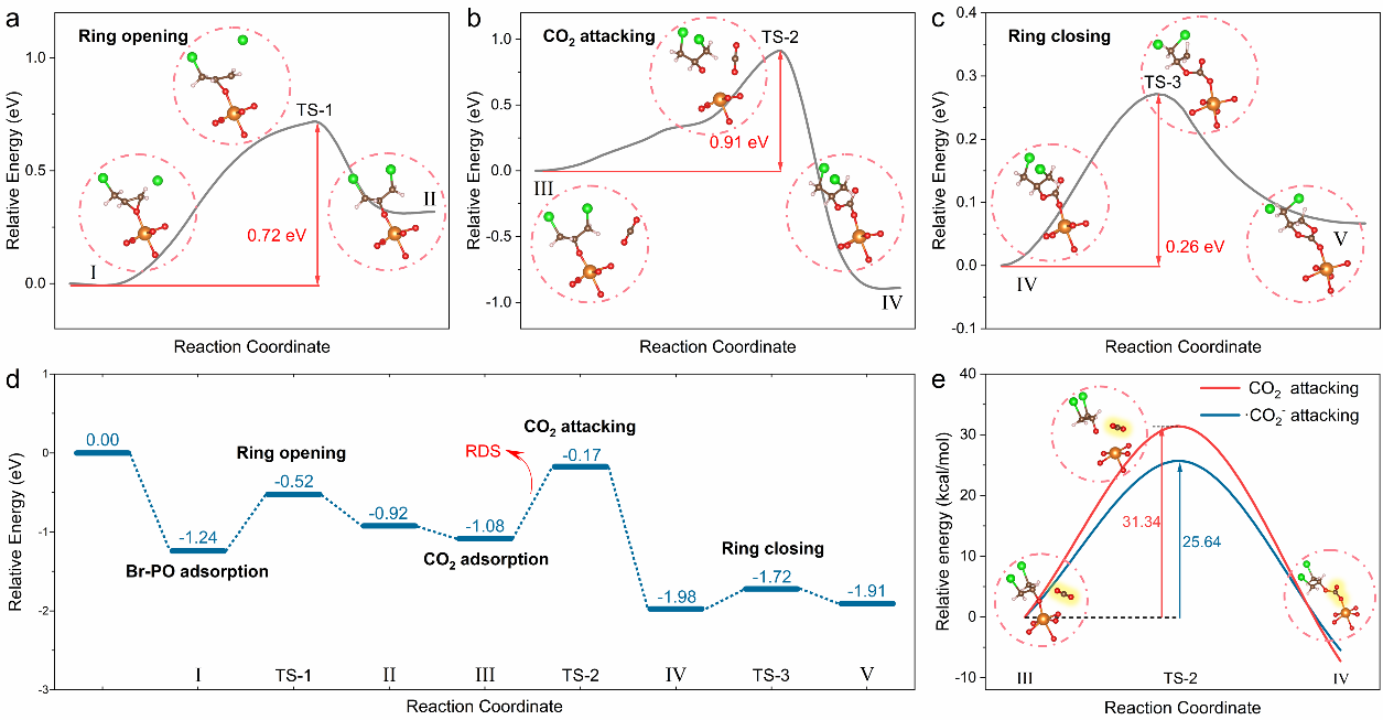 大氣中CO2濃度不斷升高導致的全球變暖和環(huán)境污染問題引起了國際社會的廣泛關注。為了解決這些問題,人們在CO2捕獲和利用方面做出了巨大努力,例如將CO2化學固定為高附加值化學品。在這些解決方案中,CO2與環(huán)氧化物的環(huán)加成生成環(huán)狀碳酸酯的反應因其100%的原子經(jīng)濟性而受到廣泛關注。此外,產(chǎn)物在極性溶劑、烯烴和芳烴萃取劑、聚碳酸酯合成原料等多個工業(yè)領域都有廣泛的應用。對于典型的CO2環(huán)加成反應來說,一般認為反應開始于以環(huán)氧化合物中的氧在催化劑表面路易斯酸位的配位吸附,以激活環(huán)氧化物的C-O鍵。然后,環(huán)在親核離子的攻擊下被打開,形成環(huán)氧化物和活性位點間的穩(wěn)定結合。隨后,CO2插入到開環(huán)后的環(huán)氧化物中形成碳酸烷基酯中間體,最終在經(jīng)過閉環(huán)步驟后轉(zhuǎn)化為相應的環(huán)狀碳酸酯。到目前為止,熱催化是實現(xiàn)CO2環(huán)加成反應的主要方式,在開環(huán)和CO2插入步驟中需要大量的能量消耗。通過外部能量注入加速惰性CO2分子的熱振動,導致原本的O=C=O線性構型彎曲,從而使得CO2插入到開環(huán)后的環(huán)氧化物中。其中,要實現(xiàn)環(huán)狀碳酸酯的綠色大規(guī)模合成,降低環(huán)氧化物開環(huán)和CO2插入步驟的活化能壘,尤其是促進CO2的活化至關重要。