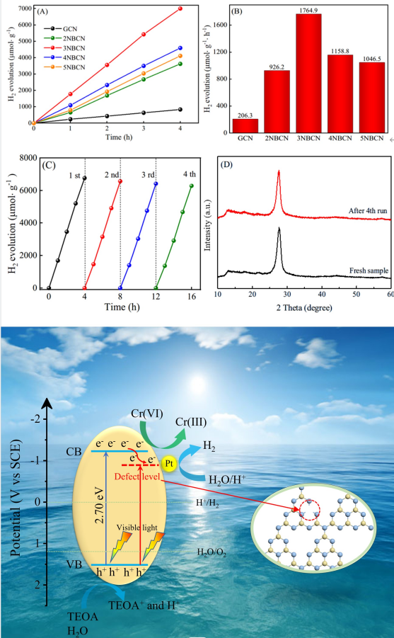 在本工作中,通過(guò)不同濃度的NaBH4溶液對(duì)g-C3N4進(jìn)行表面處理,引入碳空位,提高可見(jiàn)光驅(qū)動(dòng)的光催化還原性能。采用多種表征方法對(duì)處理后的光催化劑的晶體性質(zhì)、微觀形貌和表面狀態(tài)進(jìn)行了研究和分析。通過(guò)光譜測(cè)量和理論計(jì)算,探討了碳空位對(duì)g-C3N4光學(xué)性質(zhì)的影響。用可見(jiàn)光驅(qū)動(dòng)誘導(dǎo)水裂解法對(duì)樣品的光催化效率進(jìn)行了評(píng)價(jià),并進(jìn)行了產(chǎn)氫和Cr(VI)還原實(shí)驗(yàn)。以3NBCN為代表制備的光催化劑,通過(guò)4次光催化產(chǎn)氫循環(huán)實(shí)驗(yàn),探討了NaBH4處理后g-C3N4的穩(wěn)定性。結(jié)果表明,碳空位能顯著促進(jìn)光生載流子的分離和遷移,擴(kuò)大整體光吸收和利用,從而提高光催化性能。最后,基于所有測(cè)試結(jié)果,探討了光催化性能增強(qiáng)的機(jī)理。這項(xiàng)工作開(kāi)發(fā)了一個(gè)實(shí)用的策略,以提高g-C3N4的光催化性能。