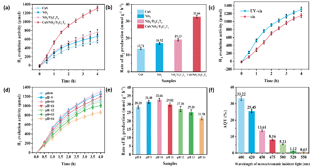 圖3 (a和b)CuS、NiS2、NiS2/Ti3C2Tx和CuS/NiS2/Ti3C2Tx異質(zhì)結(jié)構(gòu)的光催化產(chǎn)氫性能和產(chǎn)氫速率;(c)CuS/NiS2/Ti3C2Tx異質(zhì)結(jié)構(gòu)在紫外-可見光和可見光下的產(chǎn)氫性能;(d和e)CuS/NiS2/Ti3C2Tx異質(zhì)結(jié)構(gòu)在不同pH條件下的光催化產(chǎn)氫性能和產(chǎn)氫速率;(f)CuS/NiS2/Ti3C2Tx異質(zhì)結(jié)構(gòu)的AQY值