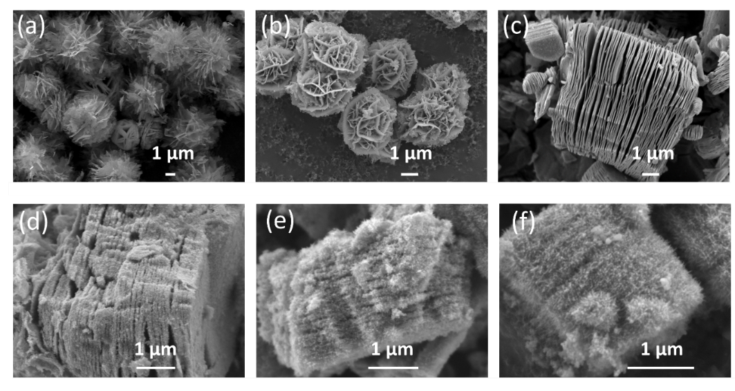 圖2 (a)CuS、(b)NiS2、(c)Ti3C2Tx、(d)NiS2/Ti3C2Tx異質(zhì)結(jié)構(gòu)和(e和f)CuS/NiS2/Ti3C2Tx異質(zhì)結(jié)構(gòu)的SEM圖