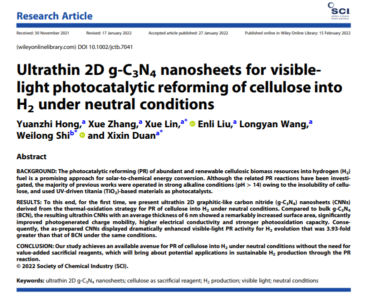 中文標題: 超薄二維氮化碳納米片用于在中性、可見光條件下的光催化重整纖維素制氫性能研究